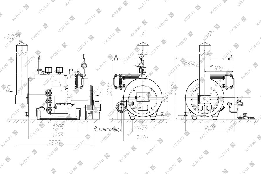 К фронтальной части парогенератора крепится бетонная плита, с фланцем для присоединения дутьевого вентилятора для подачи воздуха топочную камеру и регульрования процесса горения топлива, либо бетонная плита с фланцем для присоединения горелочного устройства и работе ггазообразном или жидком виде топлива.